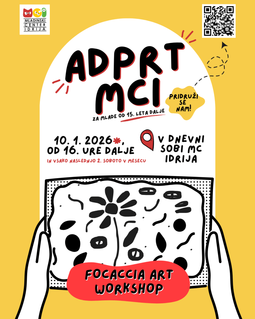 Mladi med 15. in 30. letom se družimo vsako drugo soboto v mesecu od 16. ure dalje v prostorih Mladinskega centra Idrija!